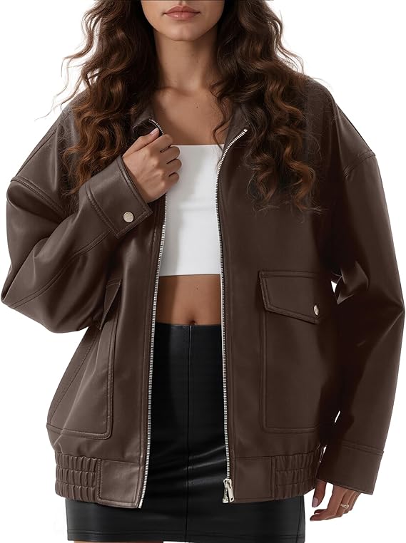 Women’s Funnel Neck Button Up Leather Bomber with Functional Pockets | Oversized Fit | Trendy Winter Coat | Christmas Gift for Her