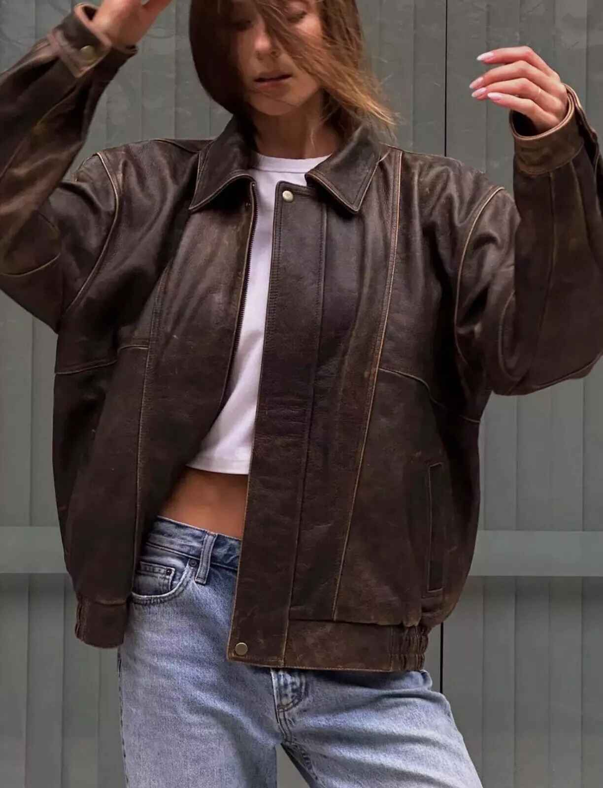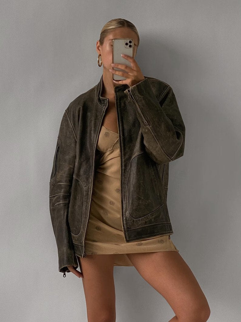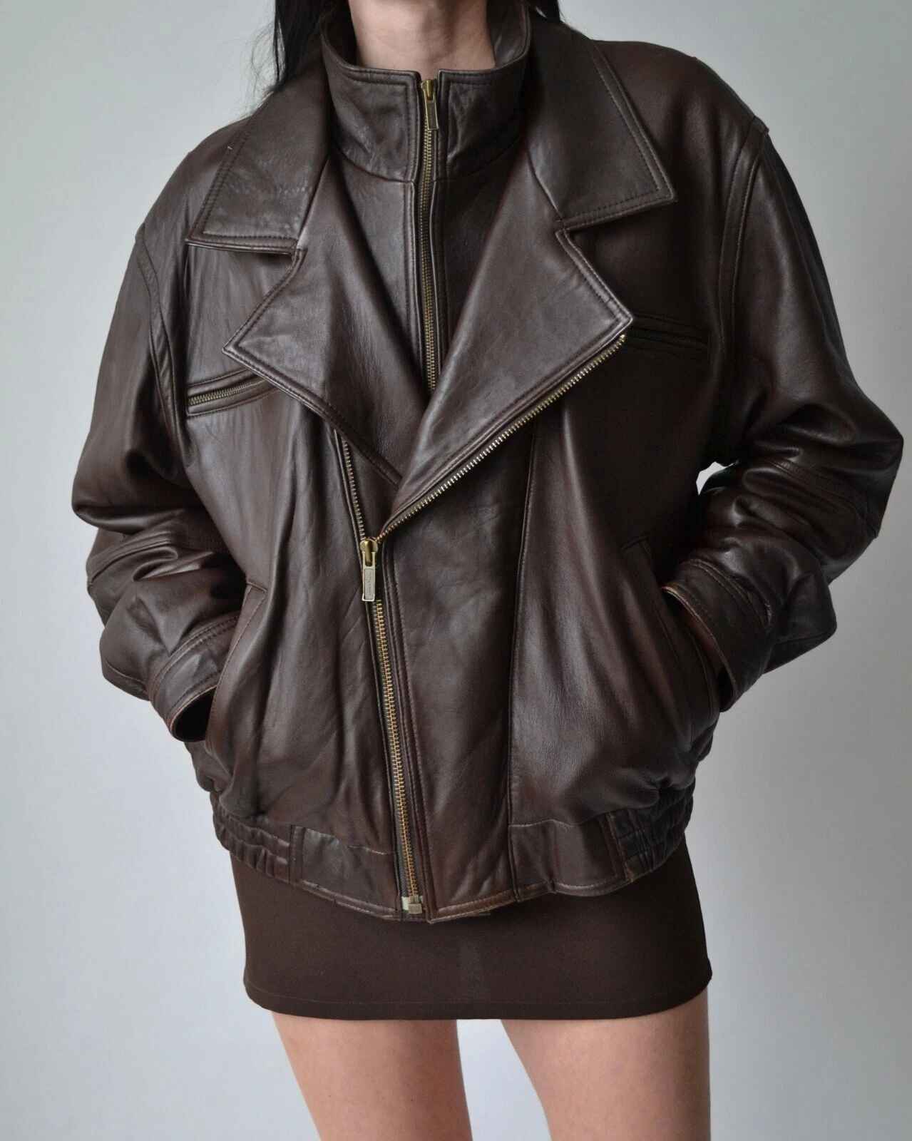 Women Classic Vintage Oversize Bomber Leather Jacket