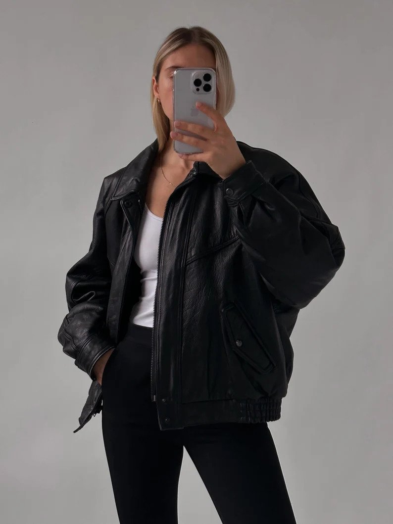 Women's Classic Oversized Black leather Bomber Jacket