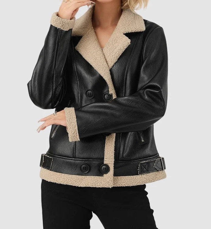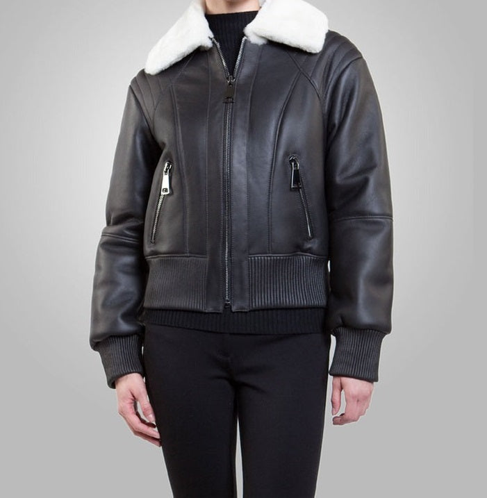Women’s Black Leather Bomber Jacket with White Shearling – Sheepskin Outer, Faux Fur Lining, Zip-Up Style