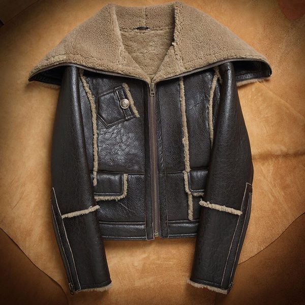 Women’s Dark Brown Shearling Long-Collar Leather Jacket – Sheepskin Outer, Faux Fur Lining, Zip Closure